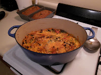For the record, I make this recipe a lot, in a lot of different ways.  This is the first time, however, that I have actually made it to the point where I have taken a picture.  It is also, frankly, the laziest I've been about it, as half of the ingredients are like...from a can.  Usually, I just use fresh ingredients on hand for the stuffing; this is also the first time I've used rice.  And I cheated, and used Goya Spanish rice instead of making and seasoning my own.  Whatevs!  The good news is this recipe is easily adaptable.  Use different ingredients for the filling, seasonally.  Use more cheese.  Don't use rice.  Use grits.  Use meat.  Use different beans.  Use seasonal veggies.  Use, frankly, whatever you want.  These are basically Mexican stuffed peppers.  Stuff at will, kids.   I think the secret is in keeping the lid on for most of the baking - it allows for a steaming effect to soften the peppers.  As is, this recipe is pretty easy.  What takes the longest will be your prep time.  Otherwise, it's pretty easy!