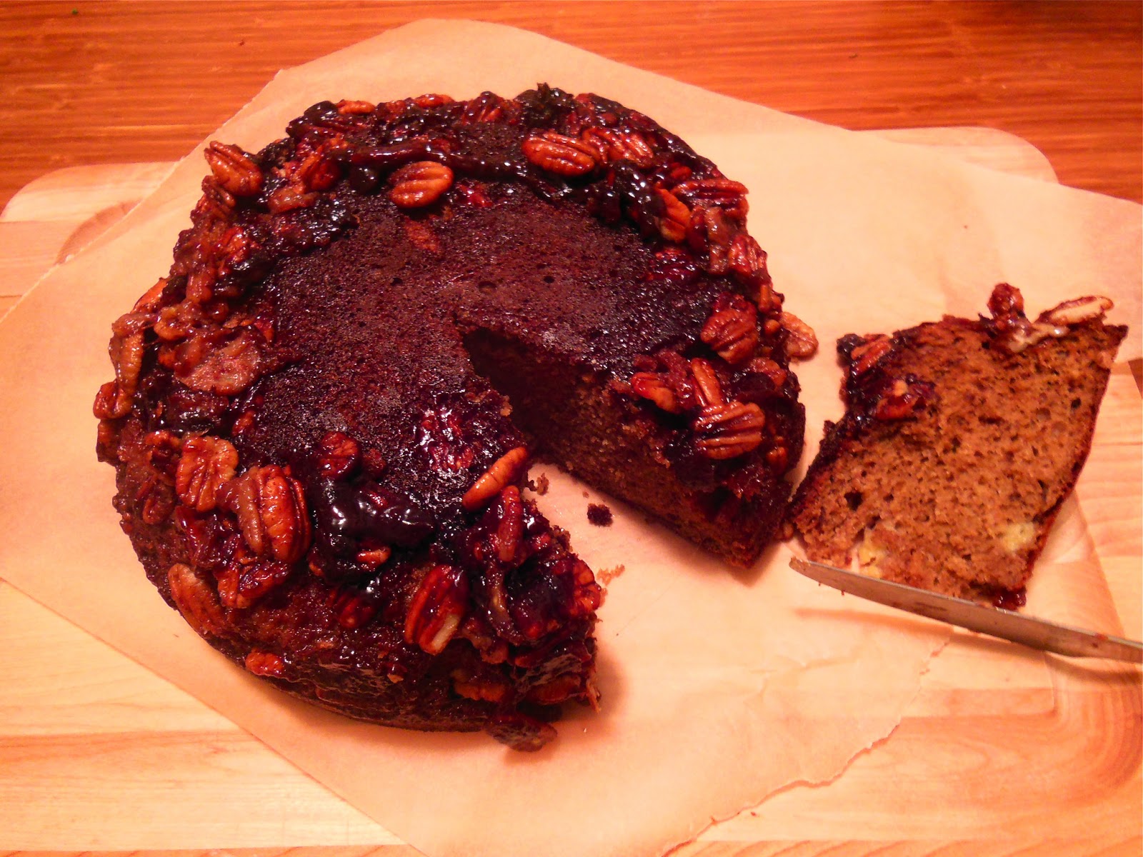 I have to admit, I had no idea how this would turn out. I've made banana bread a gajillion times, but I've never really gone in for making Pecan Pie, on account of not really liking it. Shocking, I know. I was hoping the topping would be a little runnier or have more of a solid crust across the top, but in the end it was more like a coffee cake. There are probably ways to alter it to really make it like a pecan pie filling sitting on top of banana bread, like waiting until the topping has entirely cooled to add the banana bread, or using some corn syrup, upping the butter, pecans, sugars, maybe even adding some rum, etc., but I like that pouring the banana bread in when it was still a little warm meant that it kind of created a crust down the sides and a ring on the top, avec un cake du cafe. I don't have one, but imagine that it'll be easier to get the cake out (less fear of burns from hot caramelized things!) if you use a springform pan. I often choose to use some whole wheat flour in many of my recipes because I like that it makes cakes and breads a bit more hearty, and almost lends a very light flavor of nuttiness. That said, this will be more cake-like and a little lighter if you exclusively use all-purpose flour. Don't worry too much about having perfectly mashed bananas, or little dark brown sugar balls; it adds some nice texture within the cake, especially as the topping and bread kind of bind together. In a final note, I was rather distracted by the dread scourge of laundry, and overcooked my bread just a smidge. Make sure it is a nice golden brown. Not Tan Mom bronze, because that, friends, is hard to cut (but still tastes great!). Anyways, enjoy this cake outside, on a lovely spring day, with a nice cup of tea and a copy of A Corner of White!